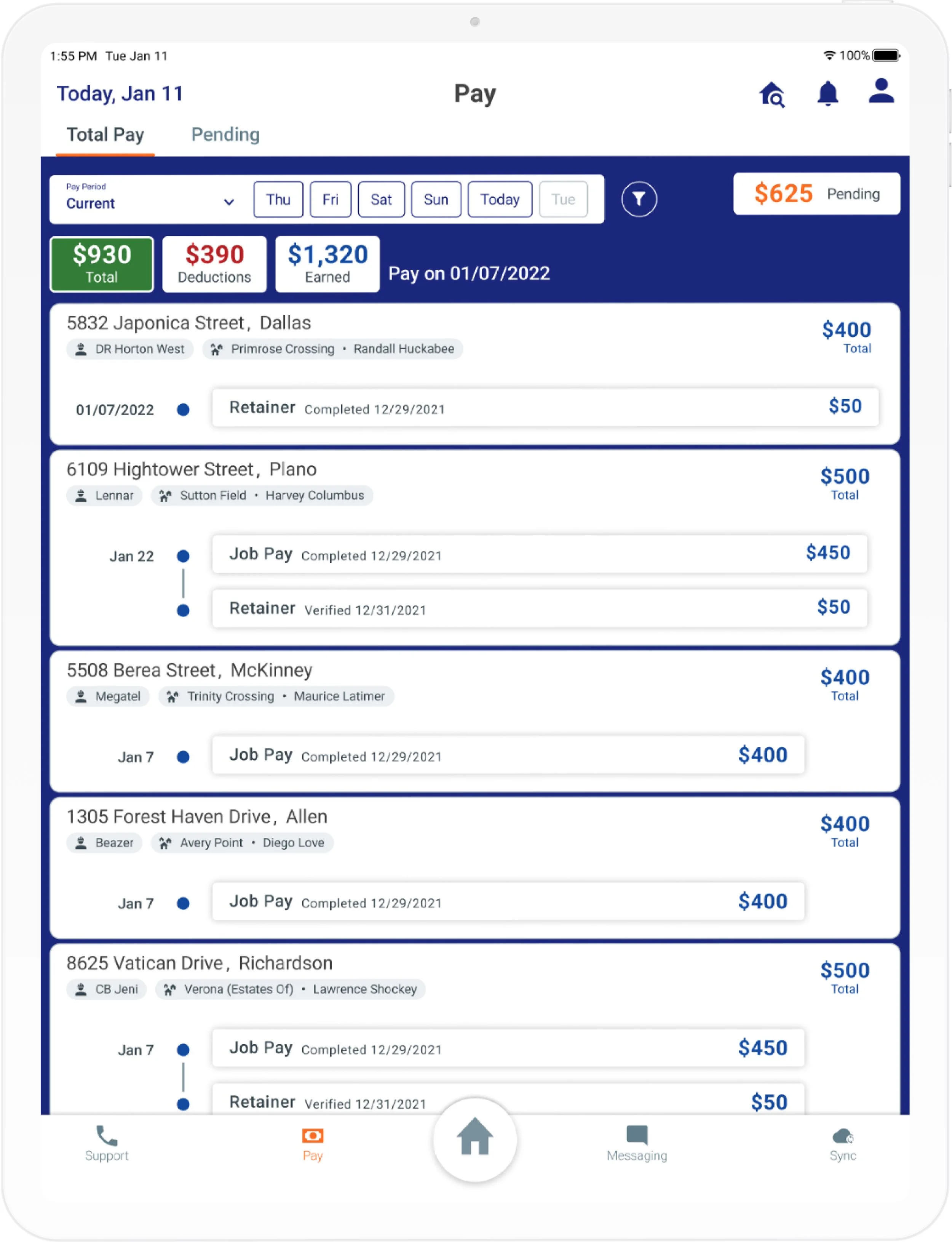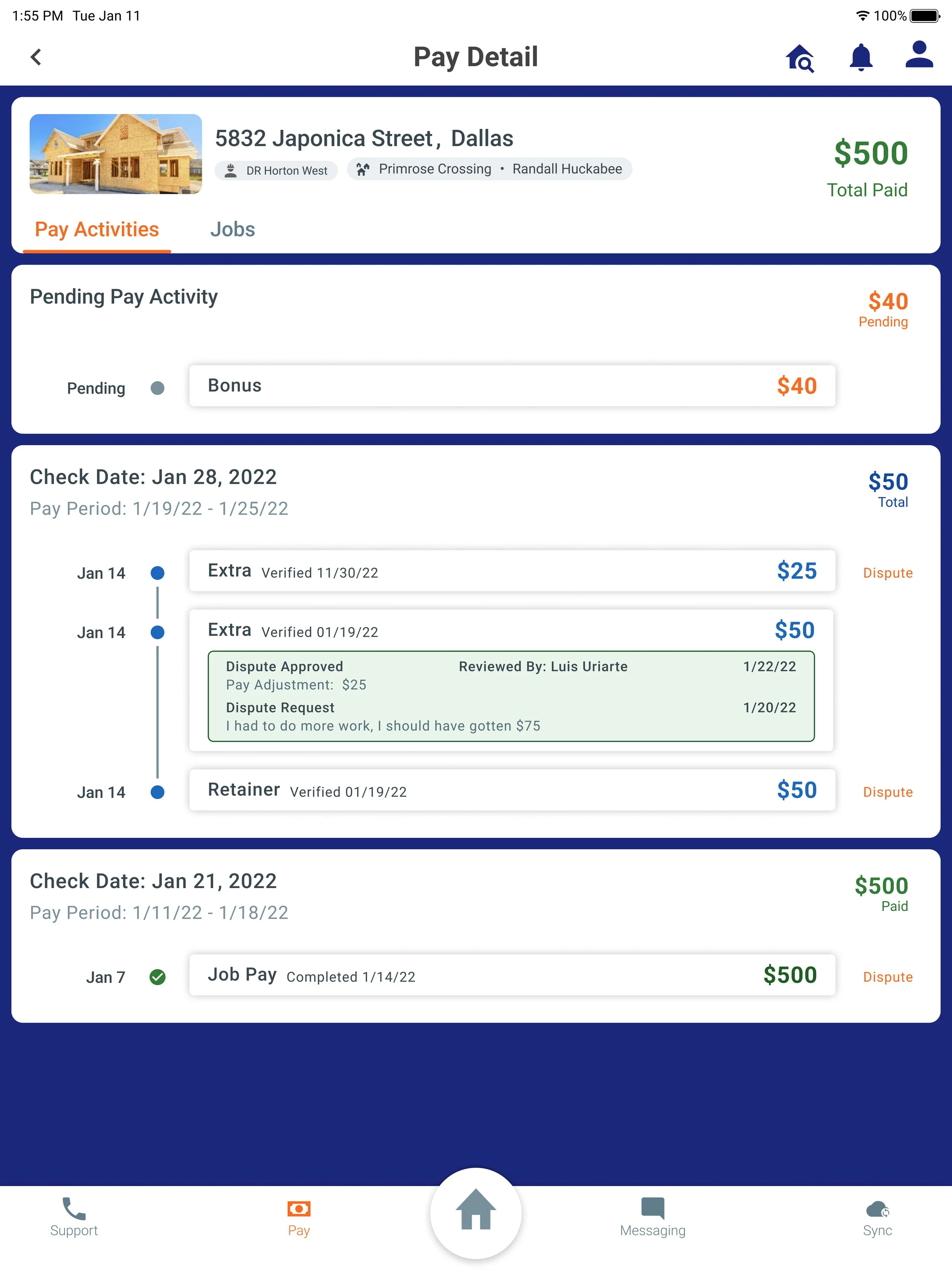 Contractors typically have low to no visibility of the pay they receive for the work they perform. This payments feature solves this issue by showing contactors their pay in real time, allowing them to view pay history, and even submit disputes.